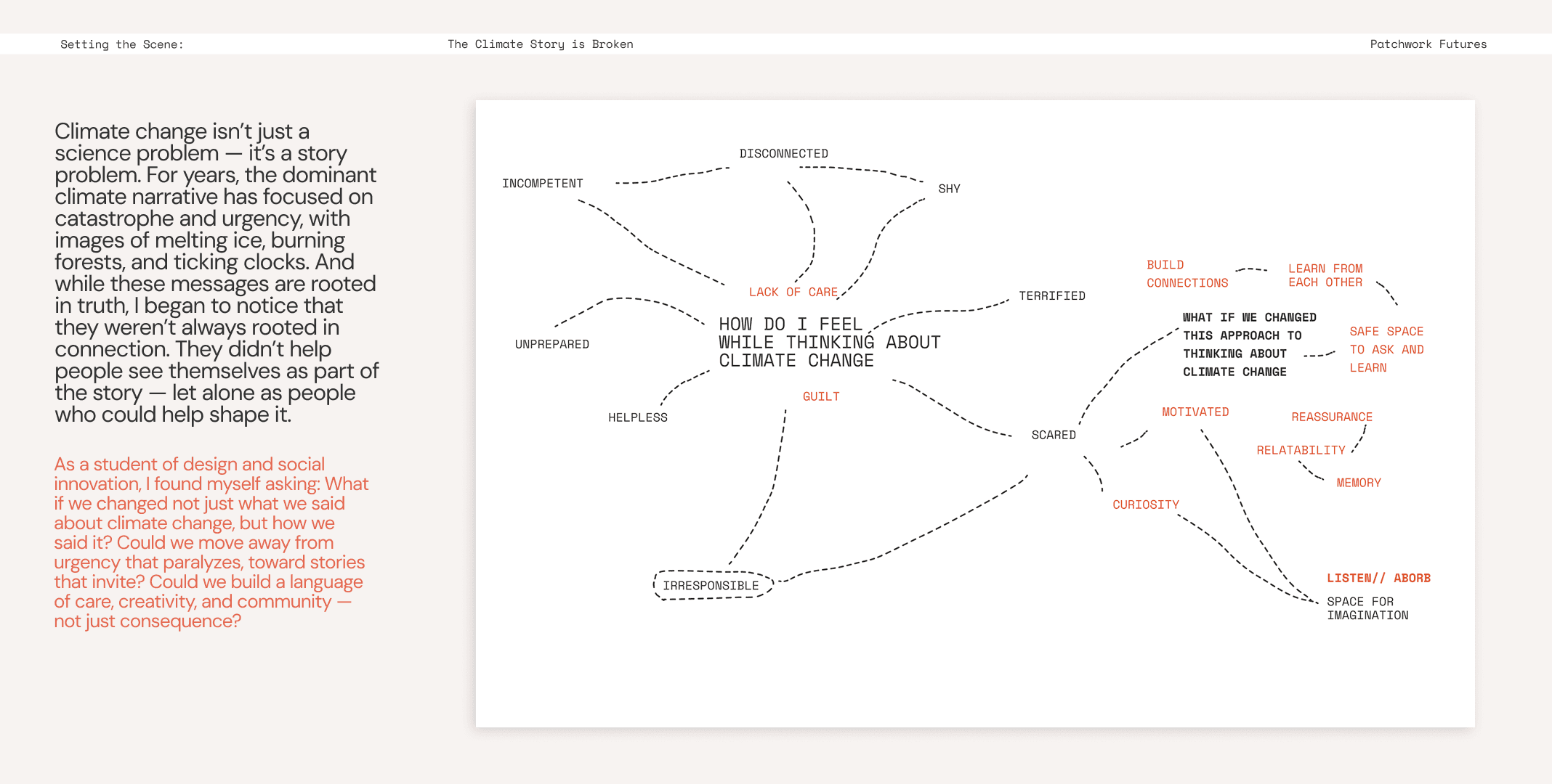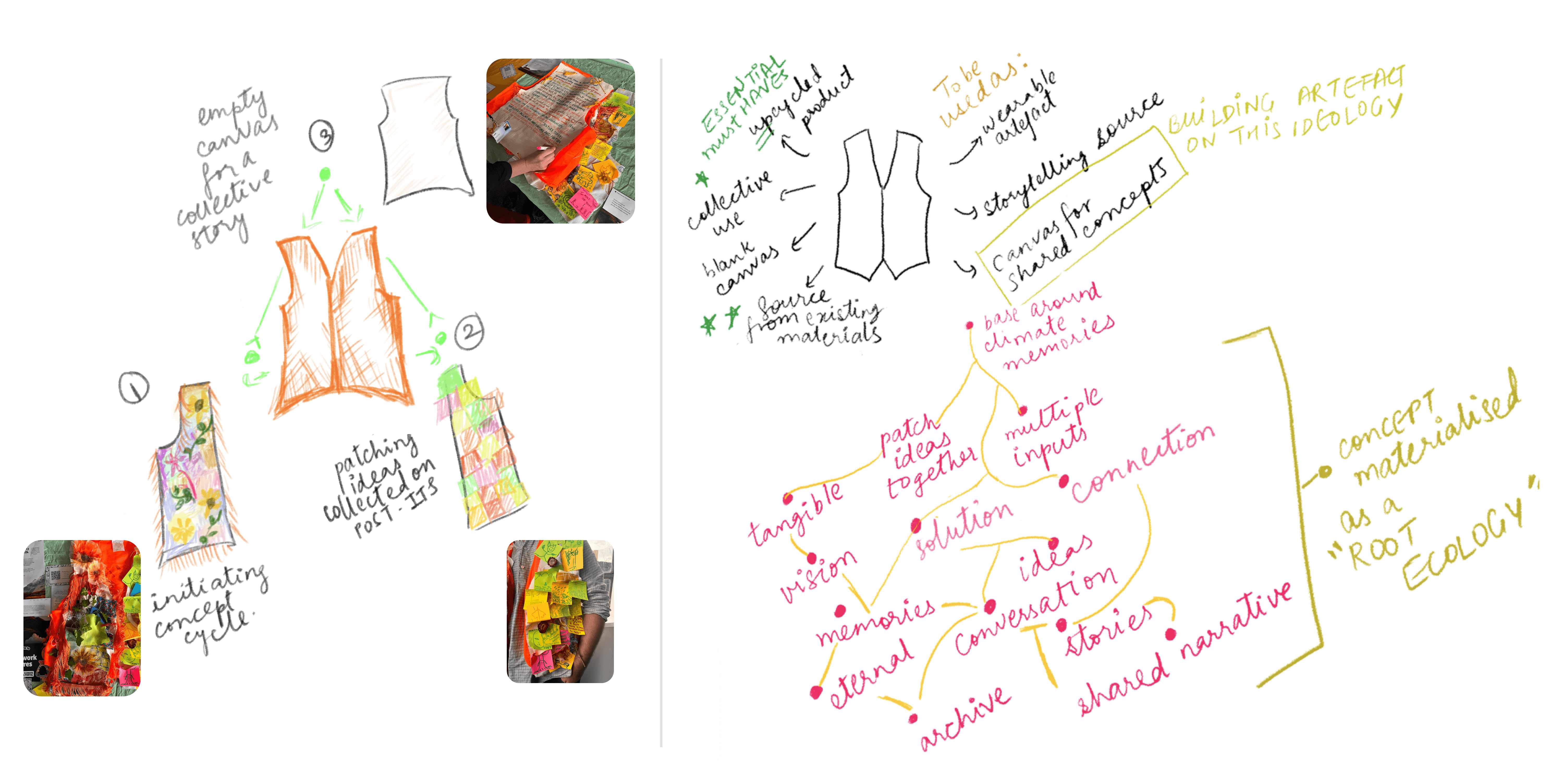 The left side carries my perspective and vision of Climate anxiety, the images adjacent features a vibrant patchwork of layered fabrics, dried flowers, and organic textures in warm oranges, deep blues, and natural elements. This section embodies the concept of "emergent responses" - representing how climate stories, like the vest itself, can be living collages of memory, hope, and creative adaptation rather than static warnings.