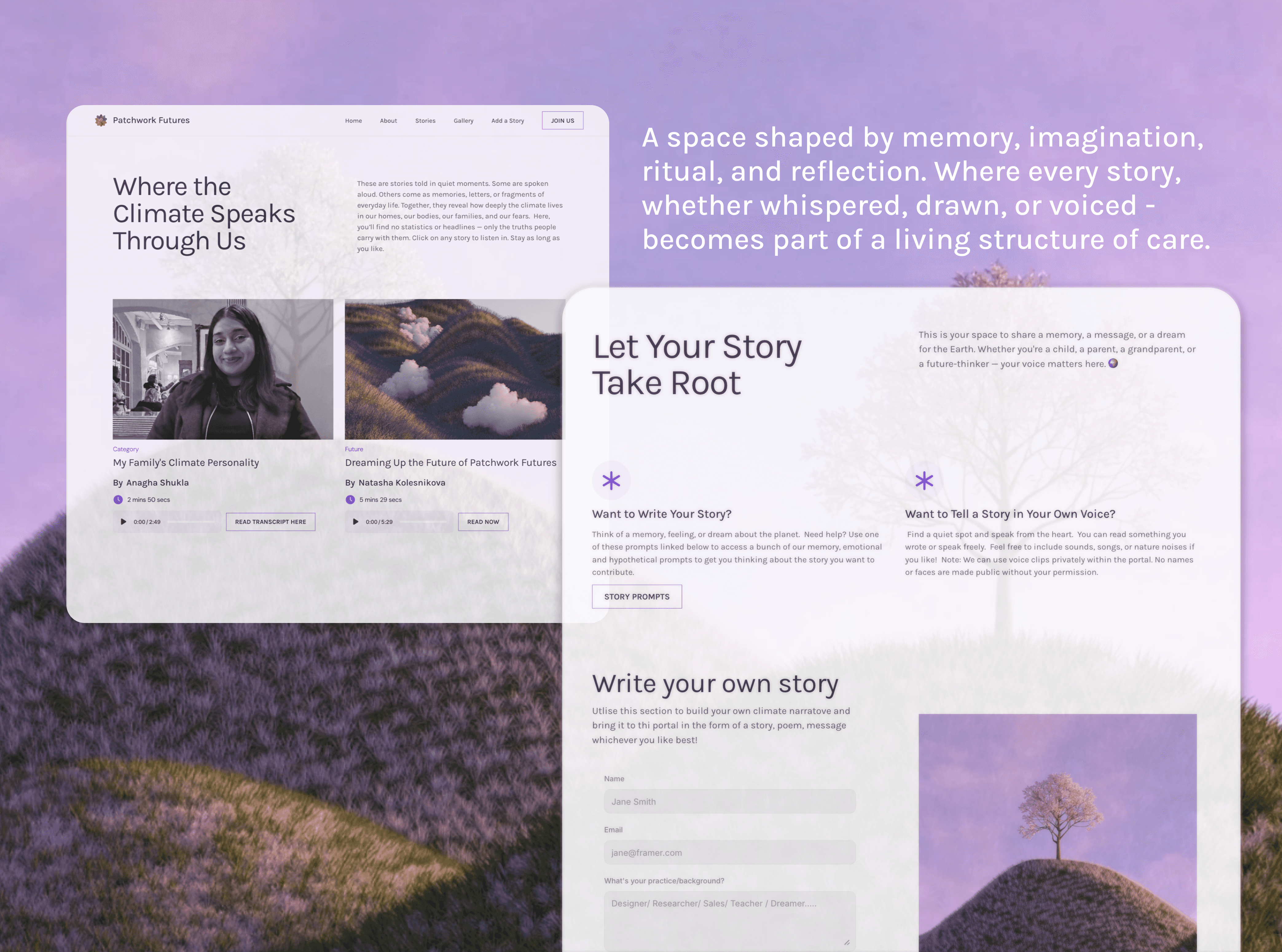 The dominant climate story tells us to worry, to consume less, to fear more. But what if we could rebuild it - not with guilt, but with connection? This project invites individuals to contribute what they remember, what they imagine, and what they care about. Not to fix the planet alone - but to co-create a shared narrative of meaning and responsibility. It’s a response to a broken storytelling system - one that left our feelings, rituals, and local knowledge out.